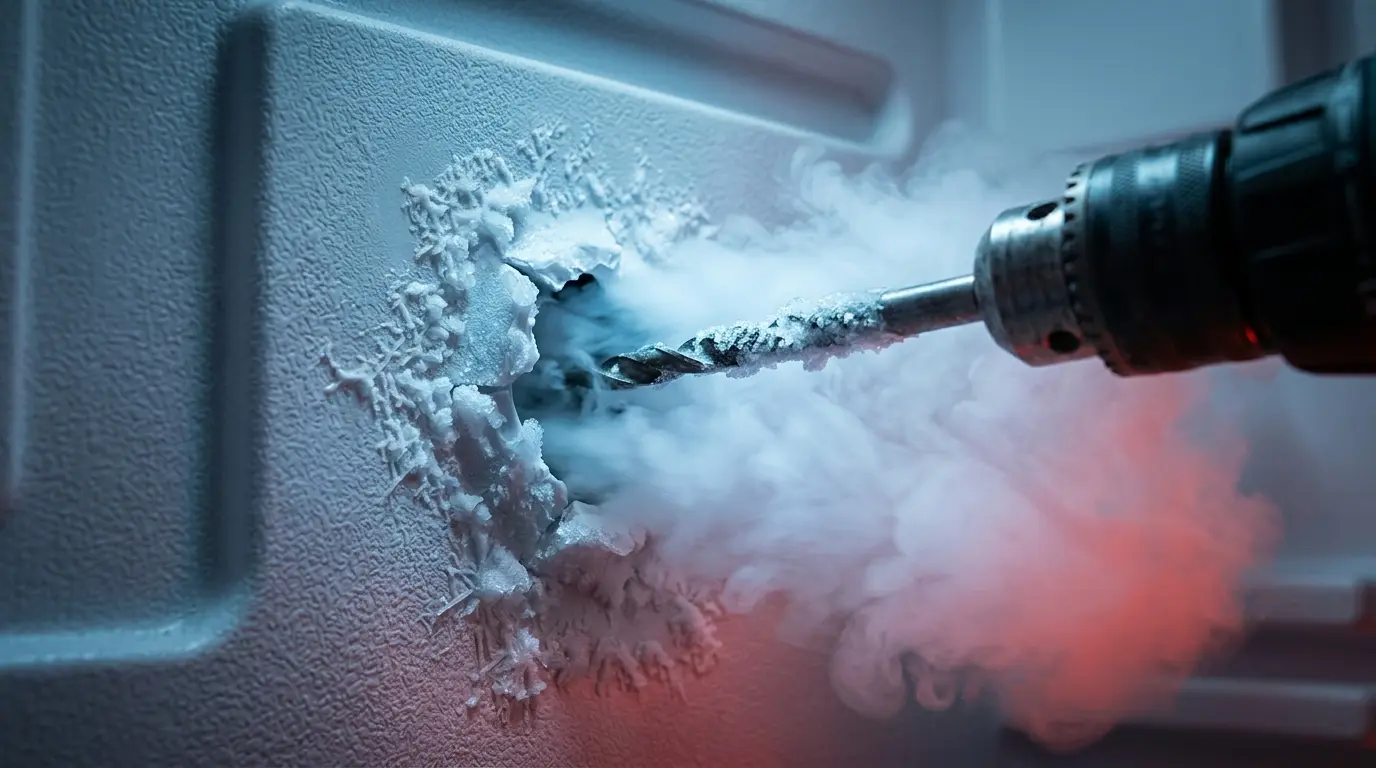 Never drill blindly into a mini fridge. To locate hidden coolant lines, mix a thin paste of cornstarch and high-percentage rubbing alcohol and paint it over the target drilling area. Turn the unplugged fridge on to maximum power. The heat from the hidden condenser lines will cause the alcohol to evaporate rapidly, leaving a dry, white, powdery map of the pipes on the surface of the fridge. For absolute safety, you must also use the “Probe and Peel” method: cut only through the inner plastic, dig out the foam insulation by hand, and visually confirm the void is clear of metal pipes before drilling through the outer steel shell.