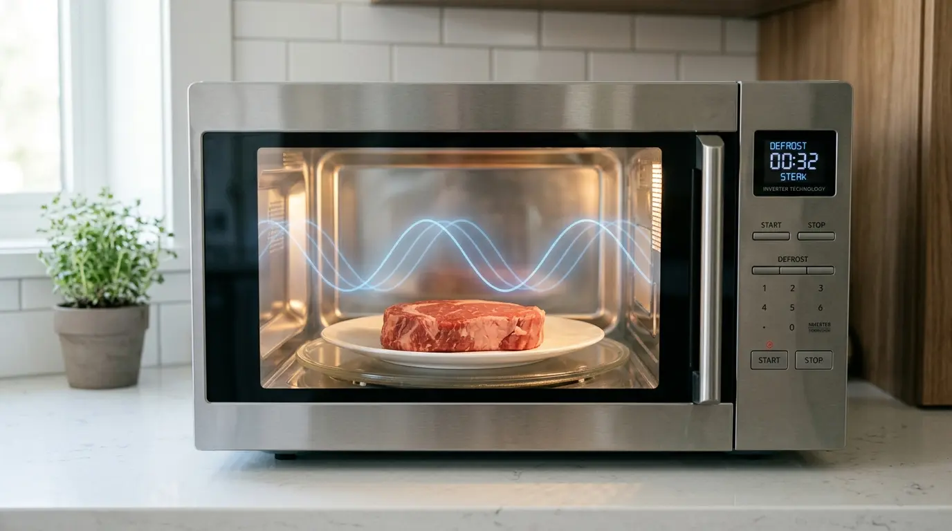 Inverter Microwave: The steady, continuous stream of low-wattage microwave energy thaws a thick steak or chicken breast evenly from edge to center without accidentally cooking the outside proteins. It safely takes just minutes.