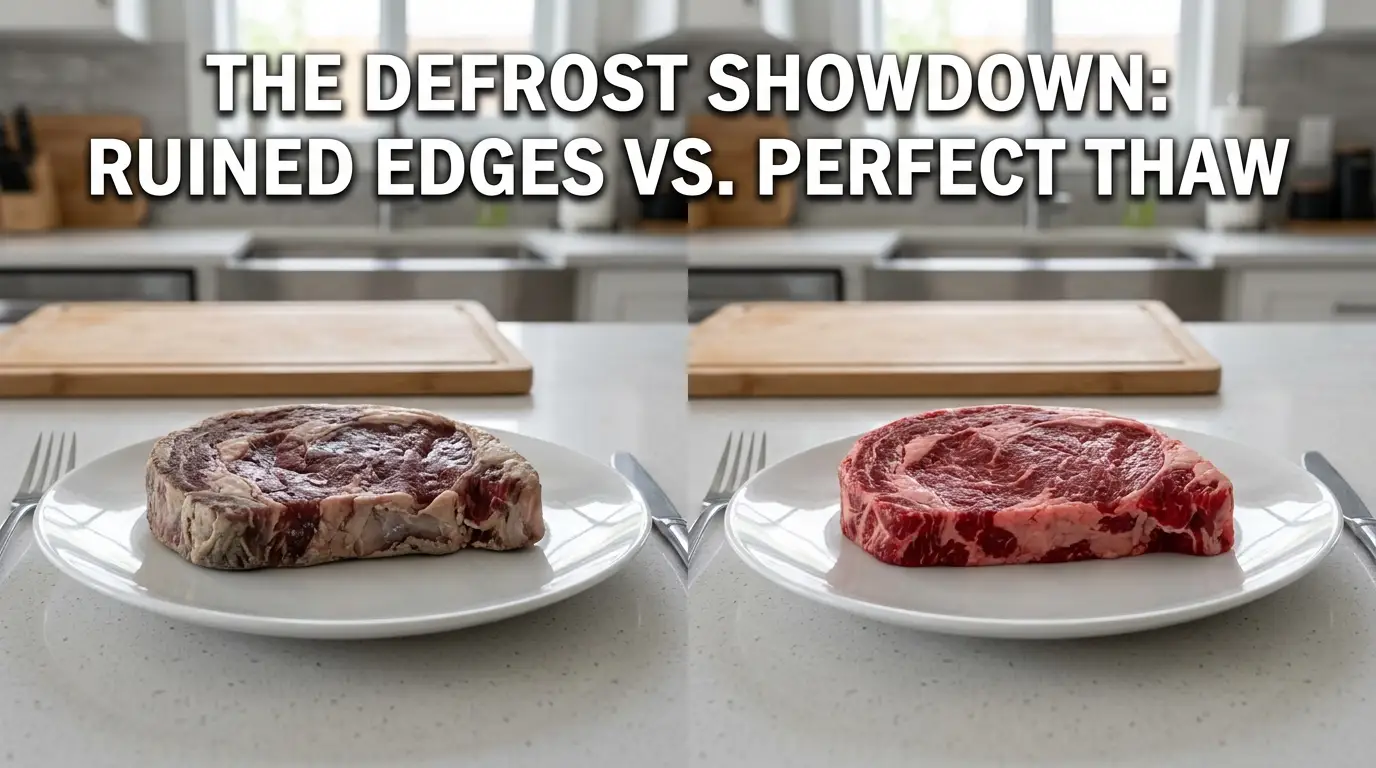 Inverter: The steady, low power thaws the meat gently and evenly from edge to center without cooking the exterior proteins.