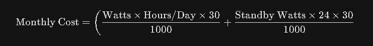 - Vampire Usage (Older model at 6W): (6W * 24 hours * 30 days) / 1000 = 4.32 kWh.