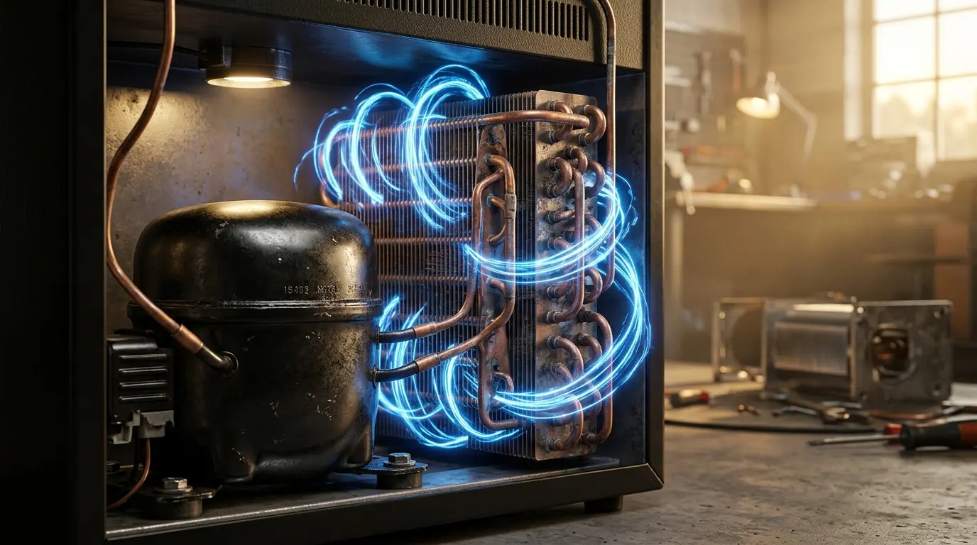 It works using a complex mechanical system: a powerful motorized pump (the compressor) and a chemical liquid refrigerant gas (like R-134a or modern R-600a). The compressor aggressively pushes the refrigerant gas through a series of copper expansion coils, rapidly absorbing massive amounts of thermal heat from the inside of the fridge and forcefully expelling it out the back. This thermodynamic process is incredibly powerful, highly aggressive, and extremely efficient at dropping internal temperatures very quickly.